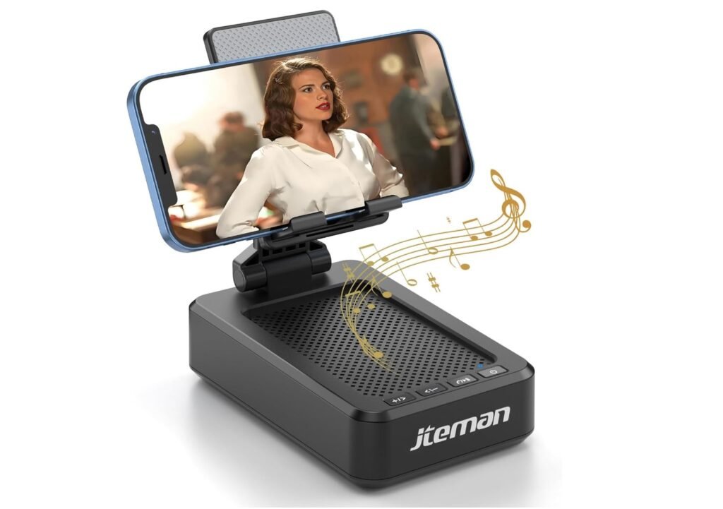 2-in-1 phone stand and Bluetooth speaker lets you watch, listen, and video chat hands-free with clearer, louder sound. The adjustable, foldable design fits most phones and tablets, with anti-slip padding to keep devices steady.