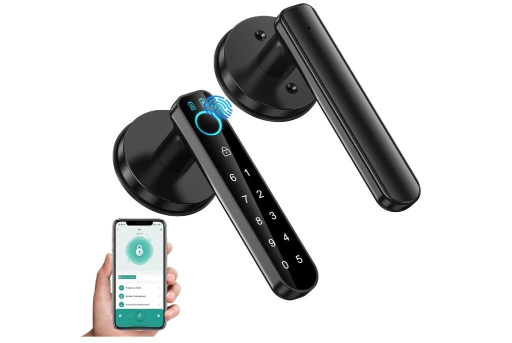 This smart door lock offers fingerprint, passcode, key, and app entry options with quick 0.3-second recognition and storage for up to 100 fingerprints. It includes a low-battery alert, USB emergency charging, and fits most standard U.S. doors. Easy to install for both left- and right-hand setups.