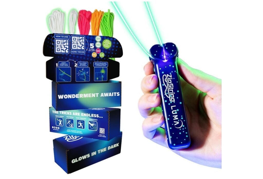 ZipString Luma is a handheld toy that shoots a loop of string through the air, letting you create shapes, tricks, and patterns—even in the dark thanks to its built-in LED and glow strings. It’s USB-C rechargeable, pocket-sized, and designed for easy use with swappable strings and safety features. Battery lasts over 4 hours per charge.