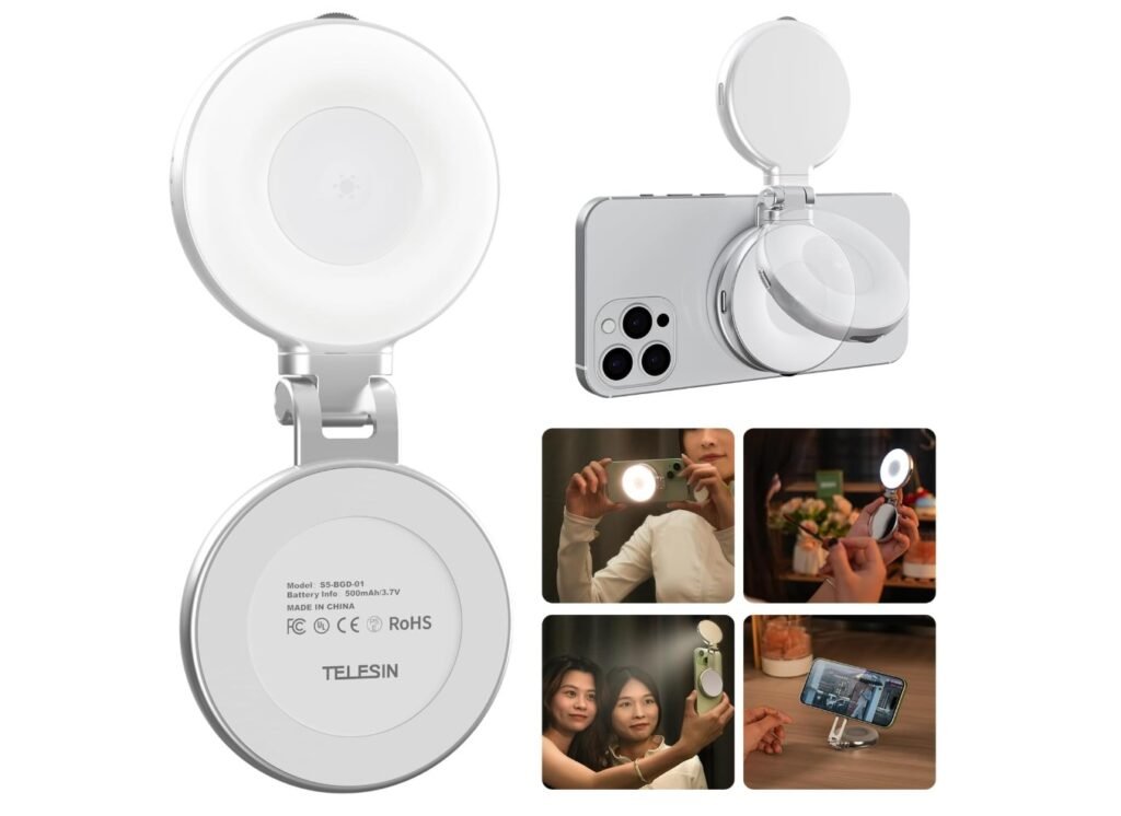 This magnetic selfie light snaps onto MagSafe iPhones or any phone with the included metal ring and offers 360° rotation, adjustable brightness, and three color temperatures. It also includes a built-in mirror for quick touch-ups and doubles as a mini stand or ambient light for video calls, photos, or content creation. Compact and rechargeable, it’s designed for on-the-go use.