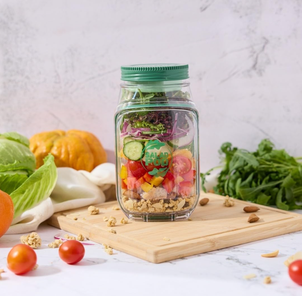 Vertical stacking keeps ingredients crisp, with a front hatch that doubles as a bowl and a leakproof capsule for dressing. Built for big portions, clean mixing, and zero mess on the go.