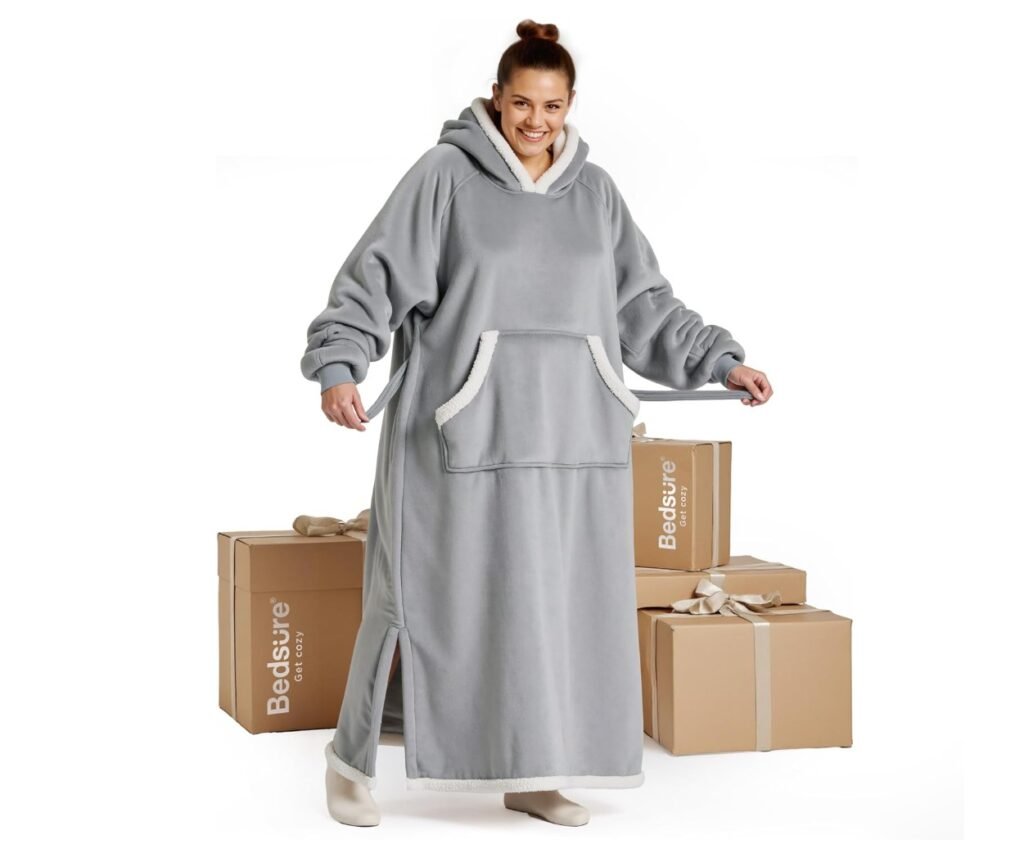 An oversized wearable blanket hoodie with sherpa lining, designed for full-body warmth and comfort. Features include a waist belt for adjustable fit, deep pockets, ribbed cuffs, and a side-slit for mobility. Available in multiple sizes and packaged in a gift-ready box.