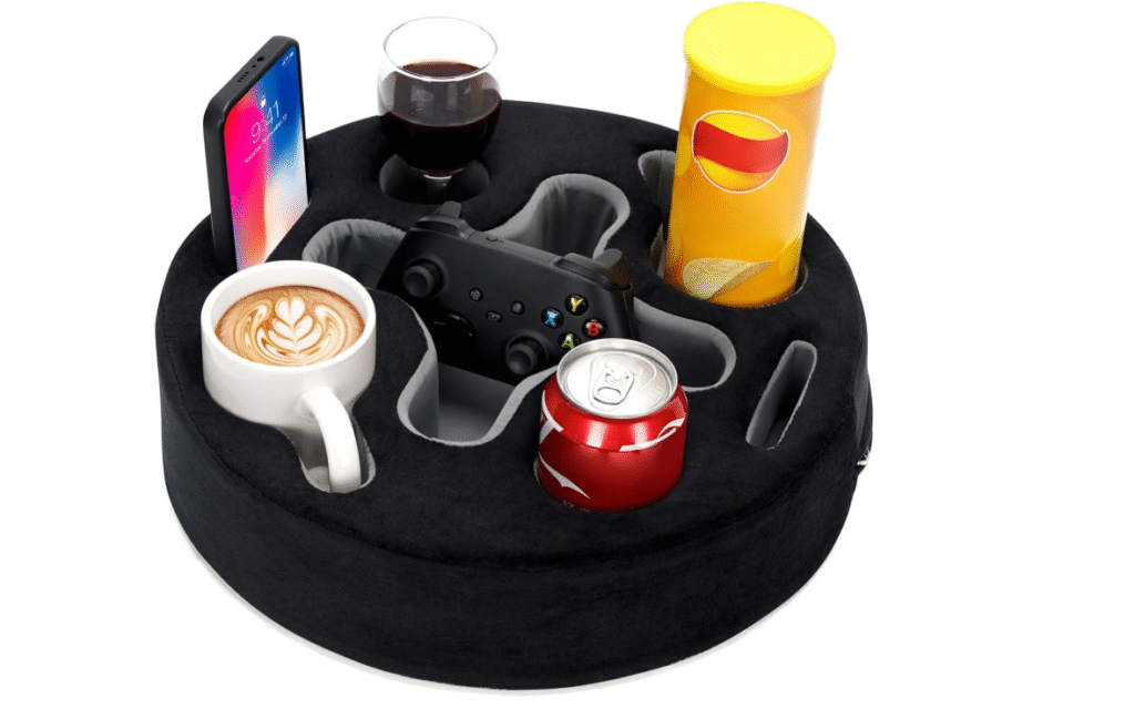 Keeps drinks, remotes, snacks, and phones in one spot with 7 compartments and anti-tip design. Stays stable on soft surfaces with weighted padding, washable cover, and sponge insulation that holds temperature longer.